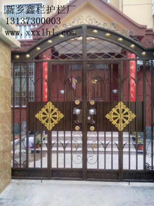 4.新鄉鑫欄護欄--鐵藝門,鑫欄護欄專業生產鐵藝門、歐式門。色彩多樣,美觀時尚,以下圖片是原陽的別墅大門。采用靜電噴塑技術,耐腐蝕,耐銹達十幾年,選護欄就選鑫欄護欄。